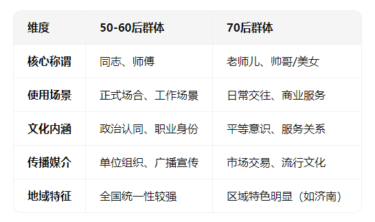 语言变迁史本质上是社会记忆的建构过程。对比50-60后与70后的称谓体系,可见显著代际差异: